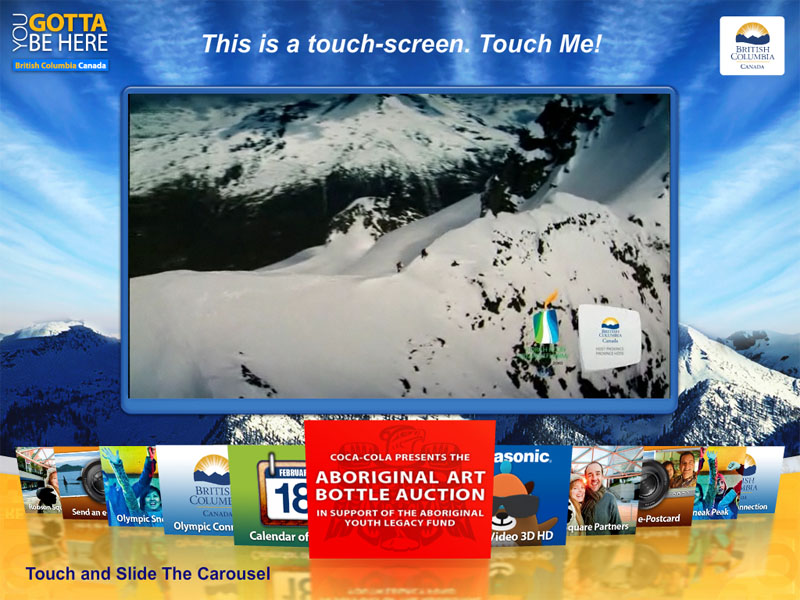 Installed a 72” Thru-Touch interactive window display in GE Plaza at rinkside. Content included large scrollable category icons, together with high resolution Promo video. To allow visitors to reach out to their family and friends around the world, E-Port enabled a live webcam to capture recorded E-Postcards that led to sendouts of web-view pages and related Olympic related links.